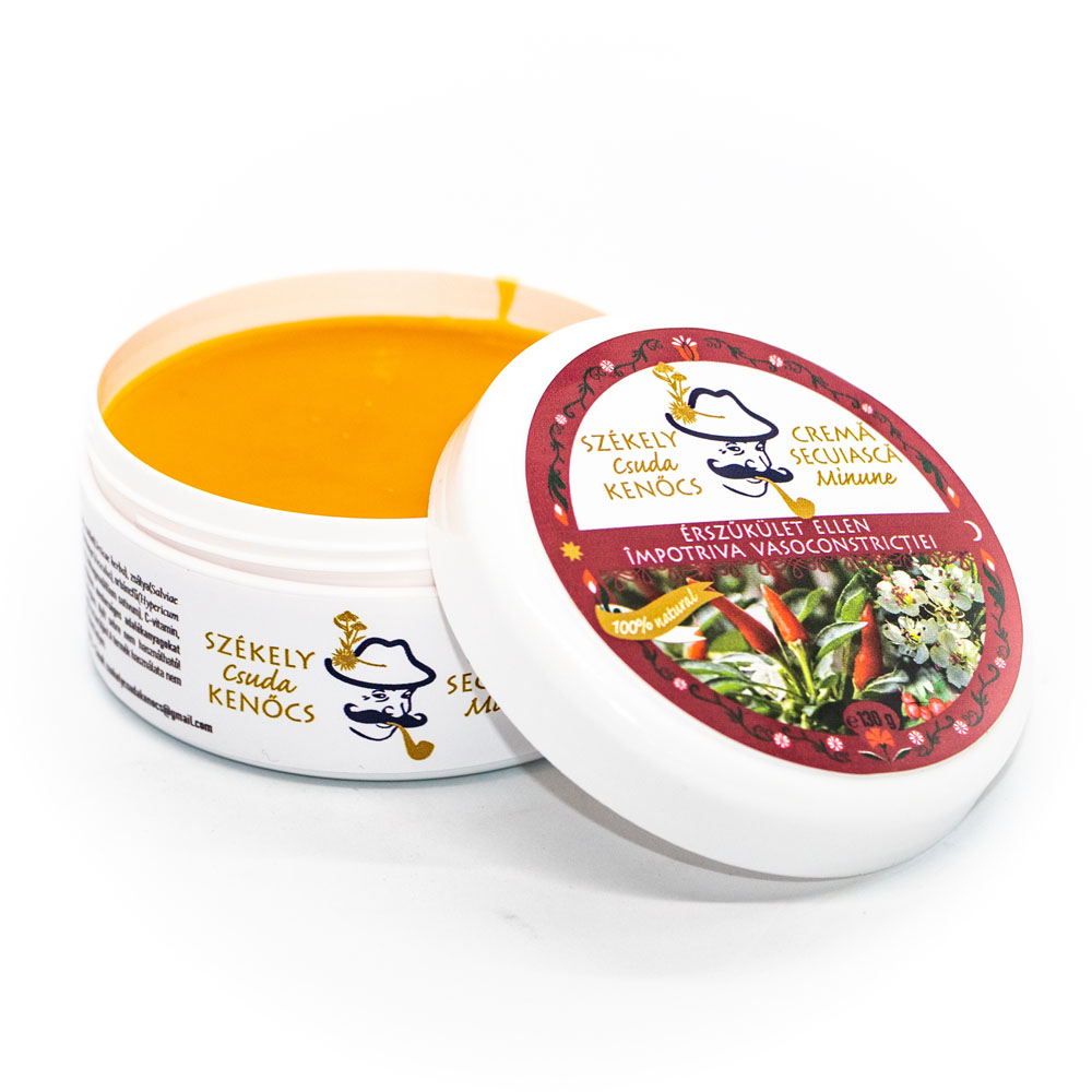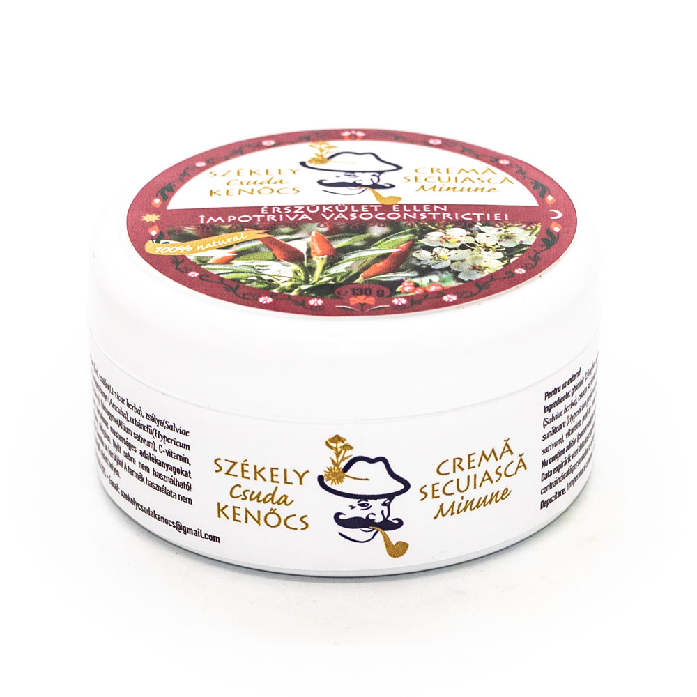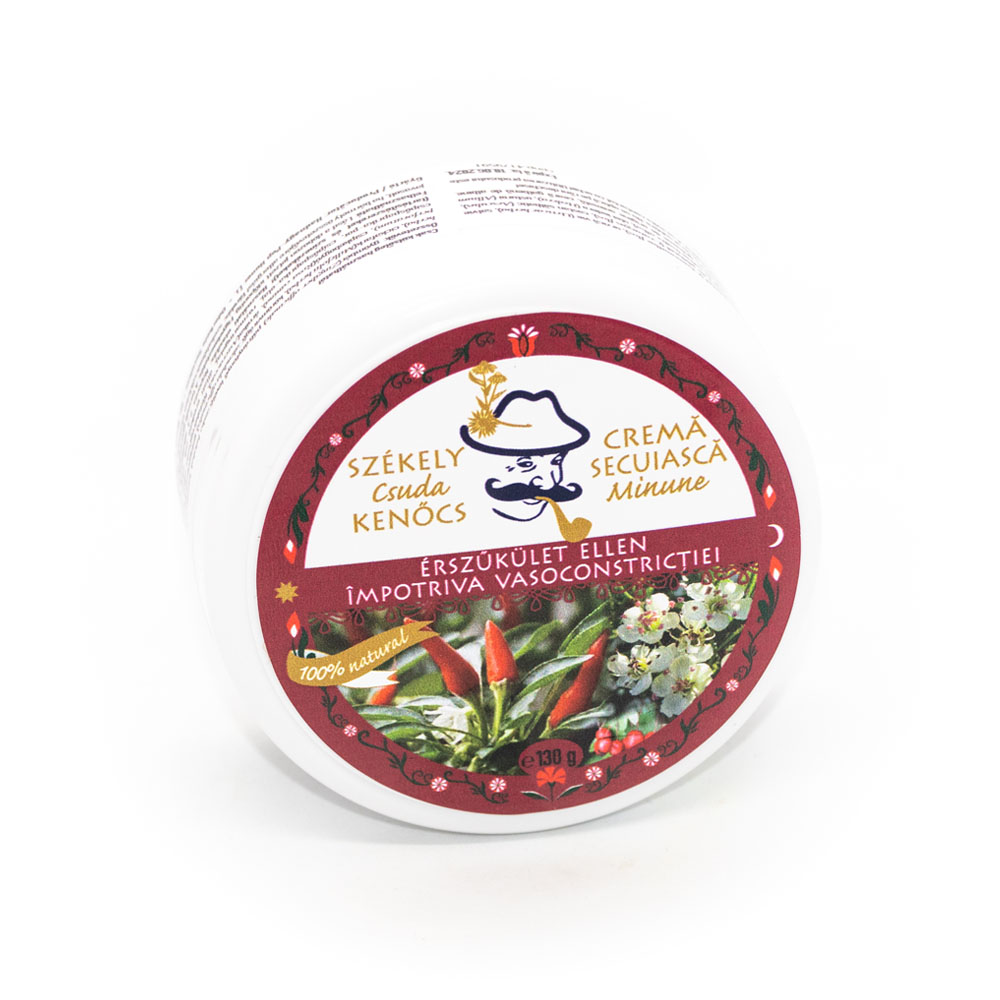 A Székely Csuda kenőcs érszűkület ellen termék használata fokozhatja a vér- és nyirokkeringést a fájó és megfáradt, érszűkületes lábakban, Jótékony hatásai a benne lévő gyógynövényeknek, valamint az állati eredetű zsiradéknak köszönhetők. A kenőcs nem tartalmaz mesterséges, adalékanyagokat, tartósítószer- és színezékmentes. Összetevői között fellelhető a gyömbér, a páfrányfenyő levél, a kamillavirág, a csalán, a, zsálya, a cickafark, a körömvirág, a galagonyavirág, a vadgesztenye, az orbáncfű, a csipkebogyó, az árnika, a fűzfakéreg, a borostyánolaj, a, fokhagyma, a C-vitamin, a csípős paprikapór, a csípős paprikaolaj, a rozmaringolaj, az állati eredetű zsír és a sárga méhviasz.